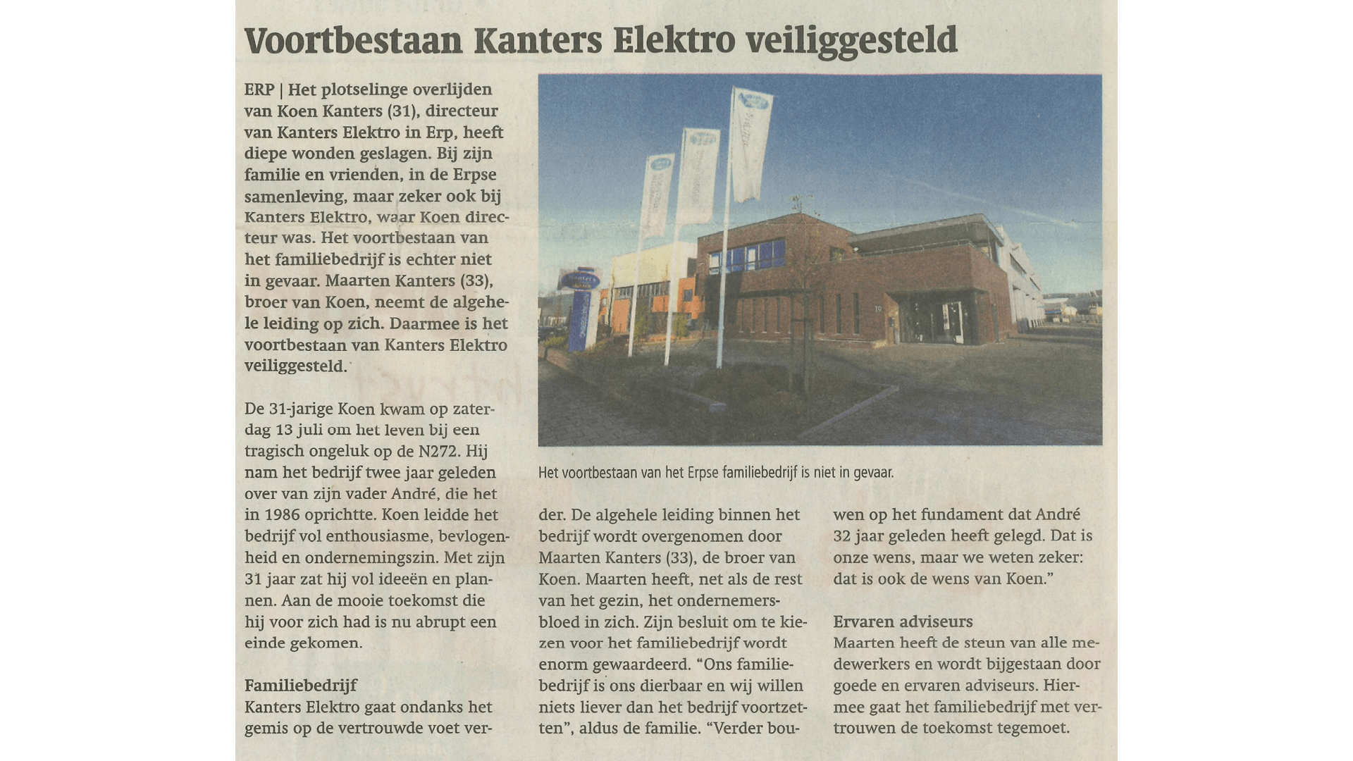 Eerder dan gepland, droeg André Kanters in 2017 officieel het stokje over aan zijn zoon Koen Kanters (17-10-1987). Koen had een opleiding tot ingenieur genoten en was al enkele jaren werkzaam in het bedrijf. In 2019 werd het bedrijf en de familie Kanters met zeer tragisch nieuws geconfronteerd. Koen Kanters kwam op 31-jarige leeftijd bij een noodlottig verkeersongeval om het leven. Om de continuïteit van het bedrijf en medewerkers te waarborgen, nam Maarten Kanters (14-10-1985), broer van Koen, de leiding om samen met het loyale team van specialisten te werken aan het zelfstandig voortbestaan van het familiebedrijf. In de jaren die volgden, heeft het bedrijf met het oog op de toekomst bewuste keuzes gemaakt. Toch is het steeds dicht bij de oorsprong gebleven. Want we weten niet alleen waar we naartoe willen, maar ook waar we vandaan komen. Het streven naar klanttevredenheid door het leveren van kwaliteit, is daarbij altijd het uitgangspunt.