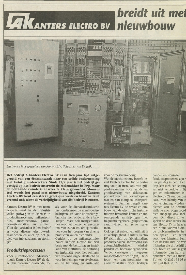 Het succes leidde tot groei en acht jaar na de oprichting werd in 1995 het eerste bedrijfspand op industrieterrein Molenakker te Erp ingezegend. De groei zette door en in 2001 was een uitbreiding noodzakelijk. Dat jaar markeerde ook het 15-jarige jubileum van het bedrijf, met een wijziging van de naam naar Kanters Elektro B.V. Het momentum werd vergezeld door een nieuw logo met actieve verwijzing op het gebied van industriële automatisering. Naast de gewenste groei in industriële activiteiten, kreeg ook het werkaandeel in de markt van grootschalige utiliteitsbouw een hoge vlucht. Door de omvangrijke ontwikkeling van (mechanische) distributiecentra in Nederland, werd deze activiteit een nieuwe pijler voor Kanters. Naar aanleiding van aanhoudende expansie betrok het bedrijf in 2014 een modern en ruim bemeten pand aan de Hoogstraat in Erp. De ruim 40 medewerkers konden hier hun werkzaamheden voortzetten. Het pand werd tijdens een open dag met trots gepresenteerd aan alle relaties.